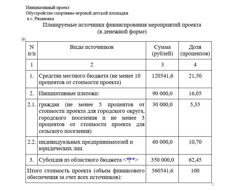 Напомним, что проекты основанные на местных инициативах предполагают следующие источники финансирования: местные жители (не менее 3% от суммы проекта),индивидуальные предприниматели и юридические лица (не менее 10%), местный бюджет ( не менее 20%) и субсидия из областного бюджета ( 60%).